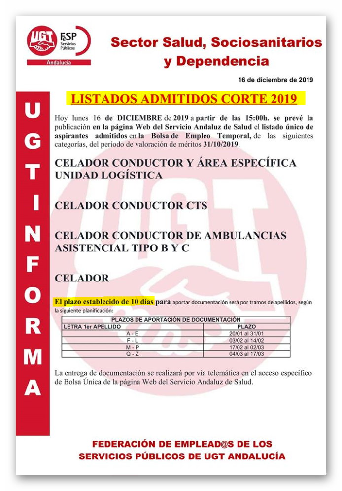 BOLSA SAS: LISTADOS ADMITIDOS CORTE 2019 CELADOR/A CONDUCTOR/A Y CELADOR/A