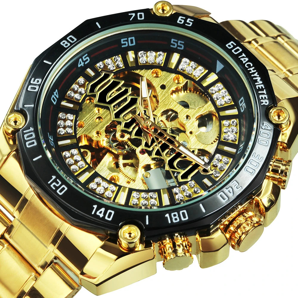 WINNER Reloj Automático dorado para hombre, cronógrafo mecánico con correa de acero inoxidable y esqueleto de Diamante, de pulsera de lujo|Relojes mecánicos| - AliExpress